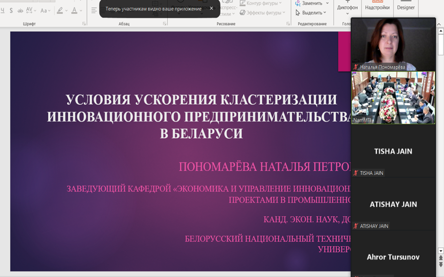 На пленарном заседании онлайн с докладом на тему «Условия ускорения кластеризации инновационного предпринимательства в Беларуси» выступила заведующий кафедрой «Экономика и управление инновационными проектами в промышленности» Пономарёва Наталья Петровна. В докладе она рассказала об актуальности кластеризации инновационного предпринимательства, развитии кластерных инициатив в Беларуси, о необходимых мерах для ускорения кластеризации предпринимательства в нашей стране.